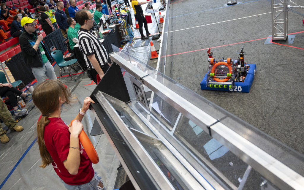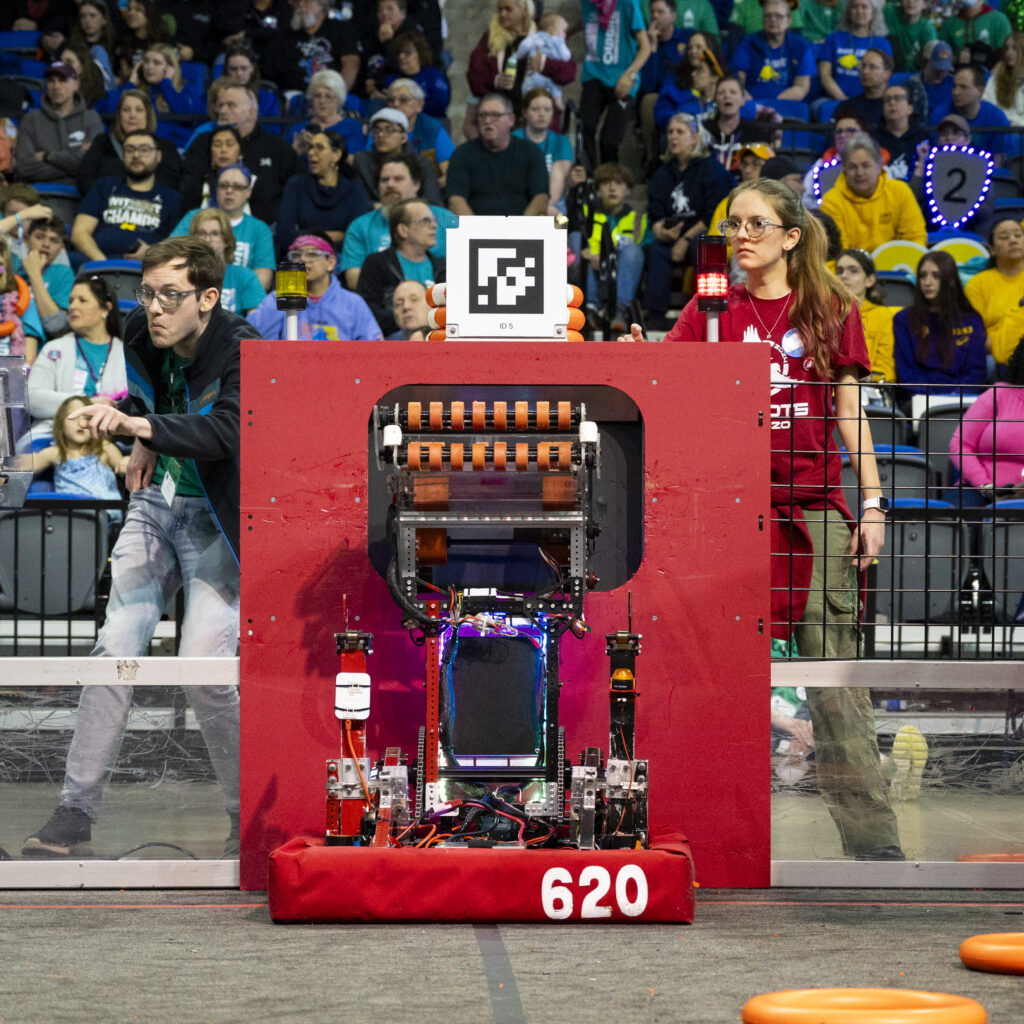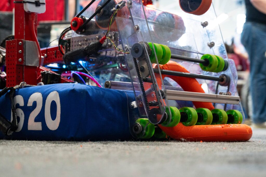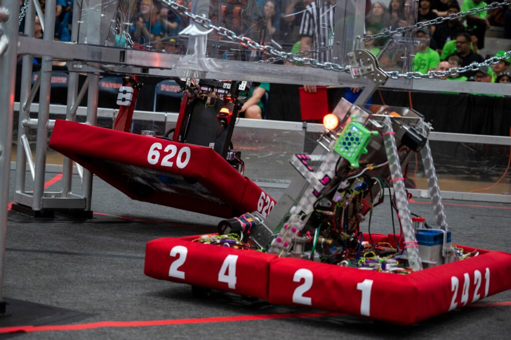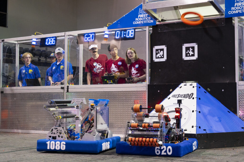 In the FIRSTĀ® Robotics Competition challenge for 2024 called REEFSCAPE, robots score points by placing “Coral” in different levels on their alliance’s “Reef” structure and by placing “Algae”. After the initial 15-second autonomous period, human players drive the robot around the field during a 2:30 minute match. In the last 30 seconds, teams can climb onto the “chain “Barge” with their alliance partners.